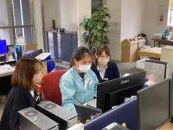 事務職として普段働いています。取引先様へ納品する際に使用する納品書の作成をしたり、電話応対、データ入力、書類整理等を日々の業務で行っています。最近ではインターンシップで来て下さった高校生のサポートもしております。